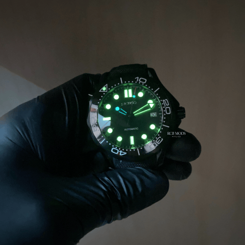 El RCB Seikomaster Full Black es la versión más atrevida y moderna del icónico diseño de buceo. Con caja y brazalete de Nylon negro, este reloj irradia carácter y sofisticación. Su bisel cerámico negro y esfera totalmente negra crean un look audaz y contemporáneo, mientras que el cristal de zafiro anti-arañazos mantiene la claridad y resistencia que esperas de un reloj premium.