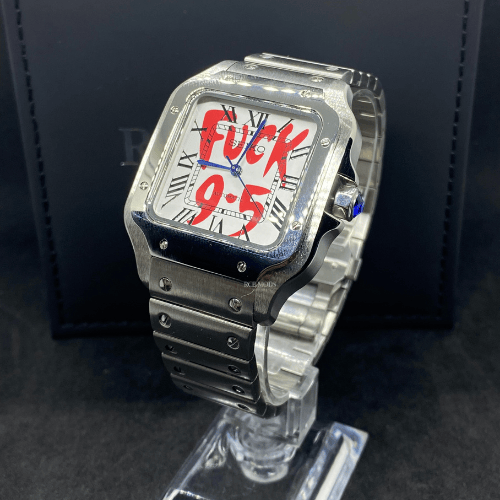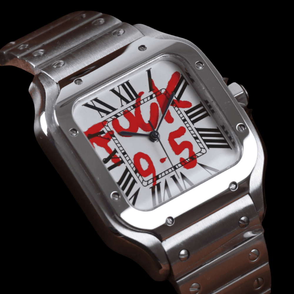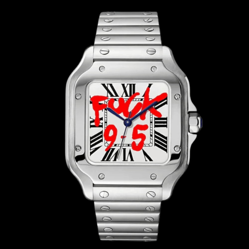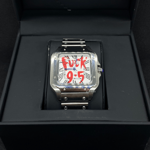 Rompe las reglas con clase. Este reloj automático de 38 mm desafía lo establecido con un mensaje directo en su corazón: “F*CK 9–5”. Inspirado en el legendario diseño cuadrado tipo Santeiko, su caja de acero inoxidable pulido y su fondo de cristal transparente dejan claro que el lujo también puede ser rebelde.