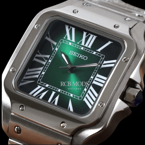 Elegancia atemporal con un aire renovado. El Santeiko Green Seiko Mod combina la esencia clásica de un diseño icónico con la frescura de un dial verde profundo que transmite sofisticación y exclusividad. La caja y correa en acero inoxidable 904L realzan su carácter premium, mientras que cada detalle —desde las agujas hasta el bisel— ha sido trabajado con precisión para reflejar lujo y durabilidad.
