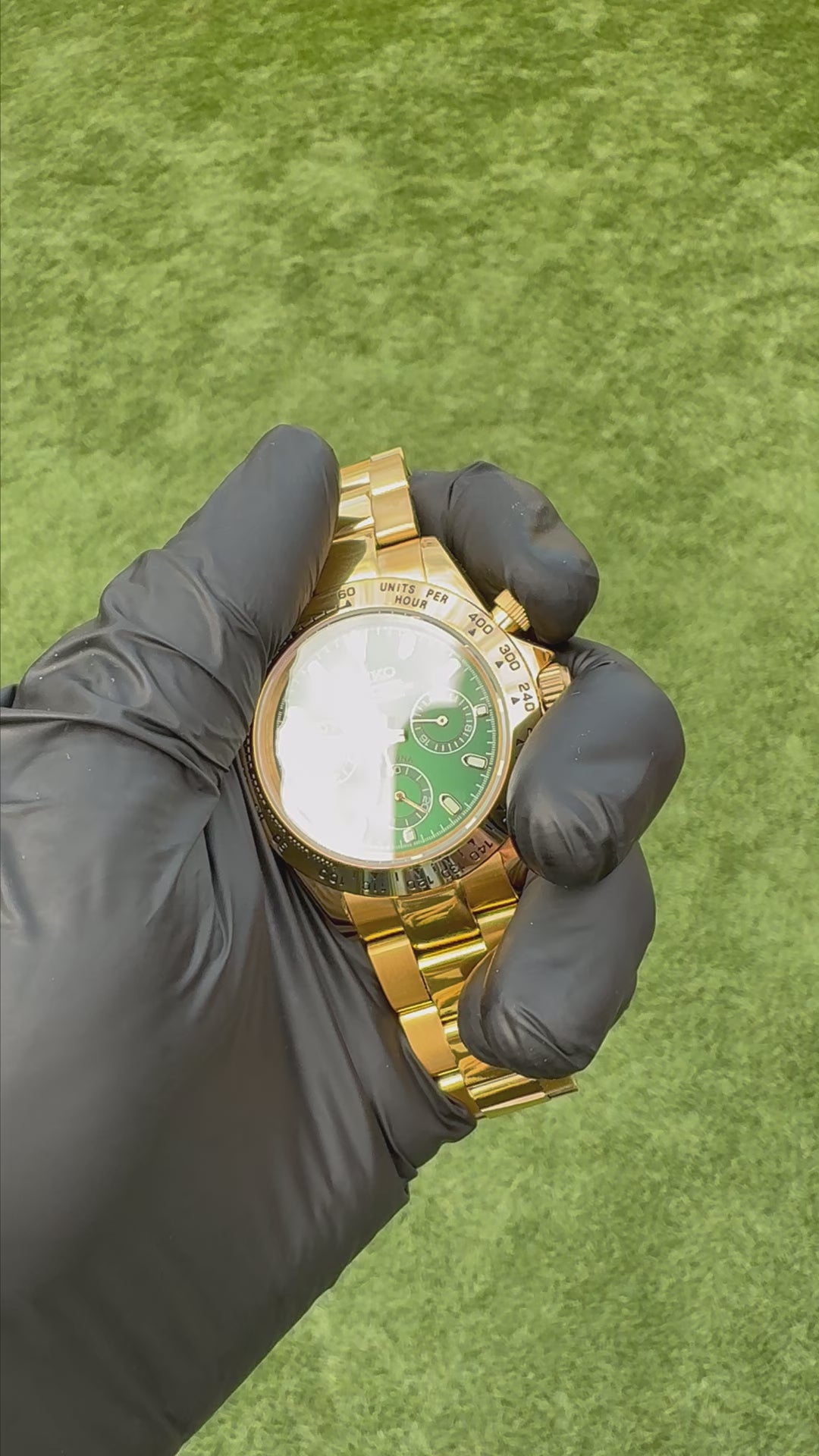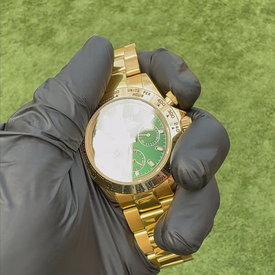 Un reloj que refleja poder y exclusividad. La combinación de la esfera verde brillante con la caja y bisel en oro crea un contraste elegante y llamativo, digno de un reloj de alta gama. Su diseño deportivo con acabado lujoso lo convierte en una pieza ideal para quienes buscan destacar en cualquier ocasión.