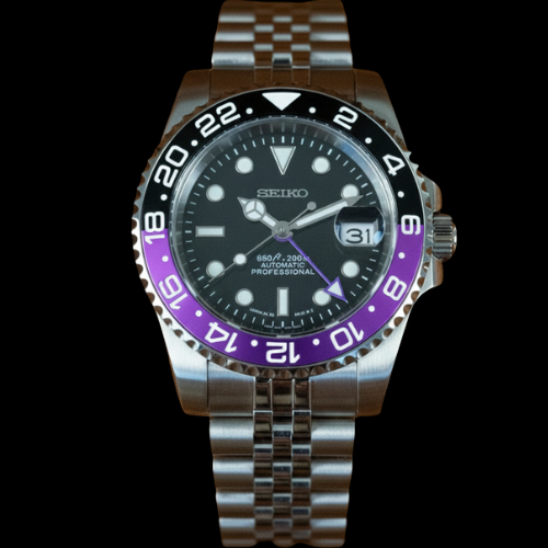El GMT Joker Seiko Mod es un reloj que combina audacia y sofisticación con un diseño único. Su bisel cerámico negro y morado, conocido como “Joker”, aporta un carácter atrevido y elegante, mientras que la esfera negra intensa ofrece contraste y legibilidad máxima. Cada detalle de este reloj refleja un estilo moderno y exclusivo, convirtiéndolo en un accesorio que impone personalidad y lujo.