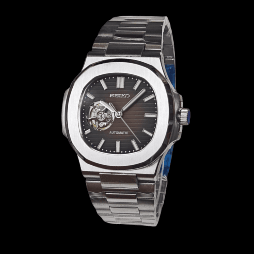 La caja de acero inoxidable 904L de 41 mm ofrece resistencia y un acabado premium, mientras que la correa de acero 904L completa un conjunto sólido y versátil. Con cristal de zafiro anti-arañazos, Luminova en agujas e índices y el fiable movimiento Seiko NH38 automático, este modelo une precisión, calidad y carácter en un mismo reloj.