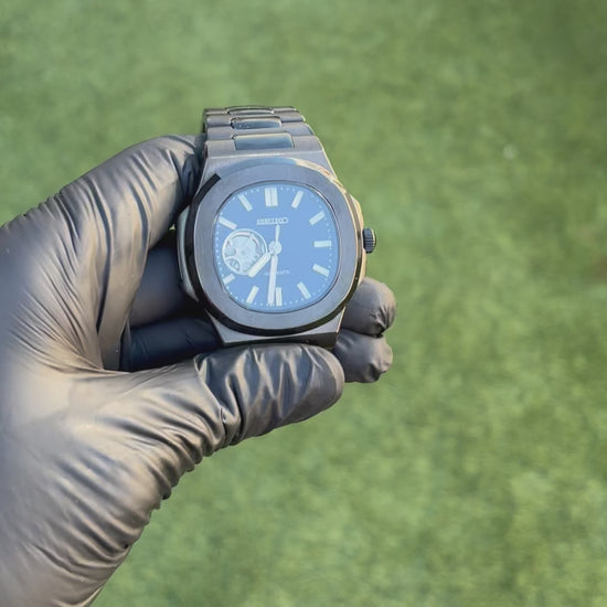 El Nautilus Openheart Black Silver Mod es un reloj con un estilo imponente y moderno. Su caja de acero inoxidable 904L con recubrimiento negro aporta un carácter elegante y atrevido, mientras que la esfera negra con detalles plateados y ventana open-heart deja ver el movimiento automático en acción, creando un contraste espectacular.