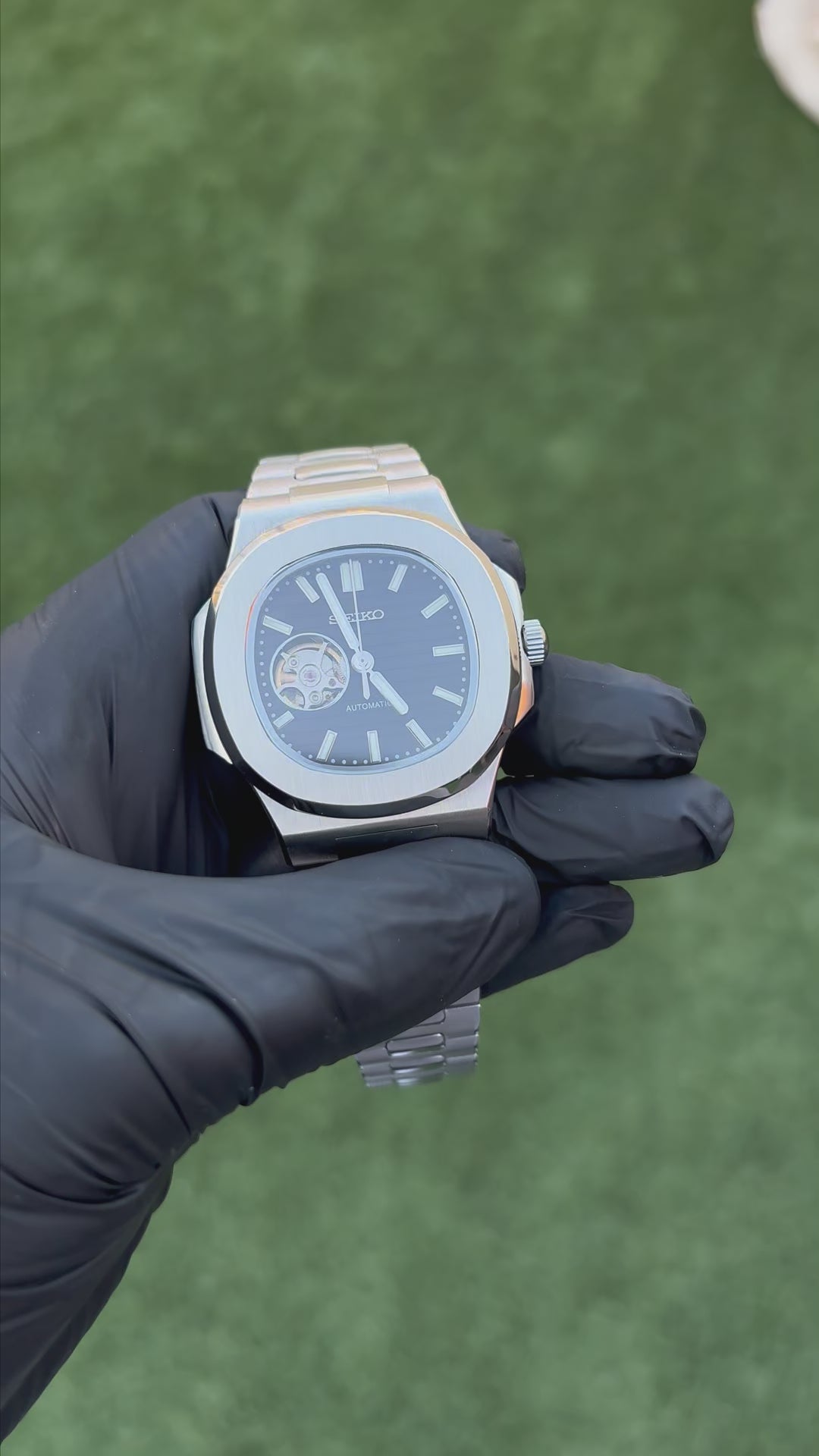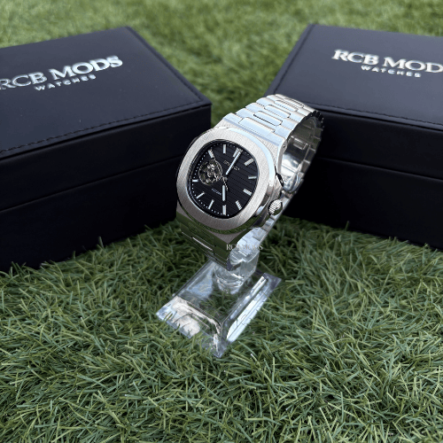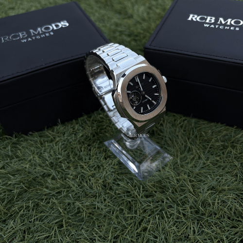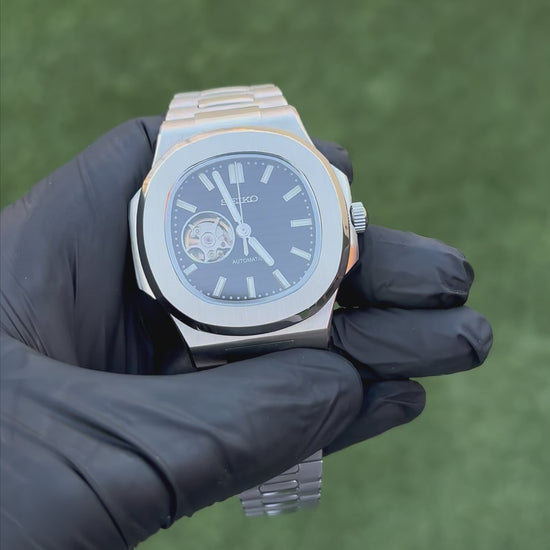 El Nautilus Openheart Silver Black Seiko Mod combina un diseño elegante con un toque moderno y sofisticado gracias a su esfera negra con ventana open-heart, que deja ver el corazón del movimiento automático en funcionamiento. Su caja de 41 mm en acero inoxidable 904L le aporta solidez y estilo refinado, mientras que el contraste entre el dial negro profundo y los detalles plateados transmite fuerza y exclusividad.