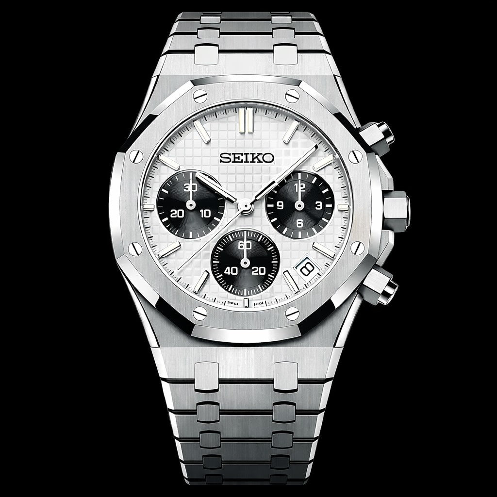 El Royal Seikoak Chrono Panda es una declaración de estilo para quienes buscan un reloj que combine lujo, rendimiento y personalidad. Su emblemático contraste entre la esfera blanca y los subdiales negros transmite una elegancia deportiva inconfundible, mientras que su construcción en acero inoxidable 316L cepillado refleja la solidez y el refinamiento característicos de RCB Mods.