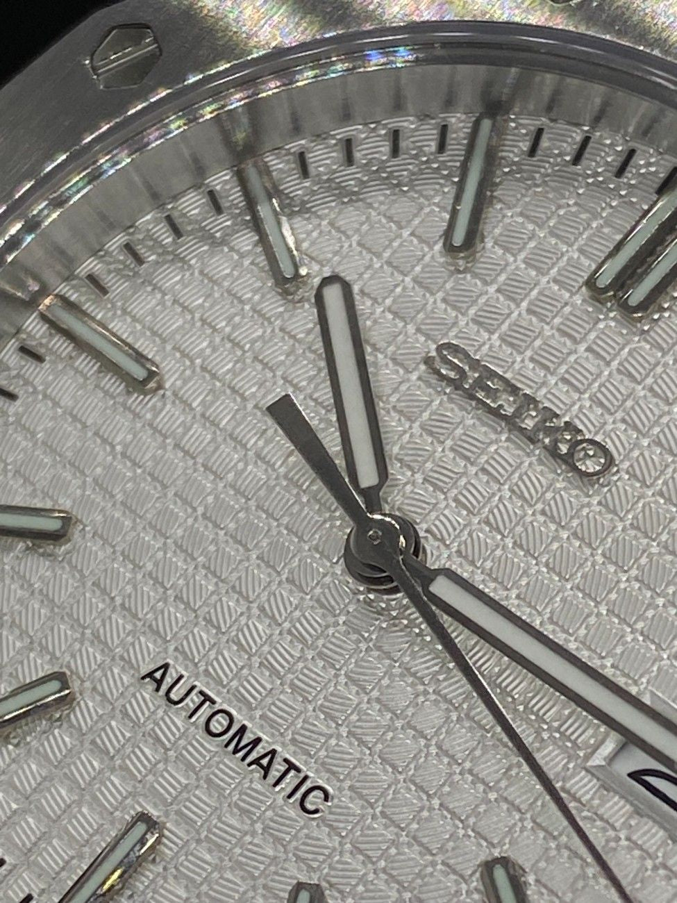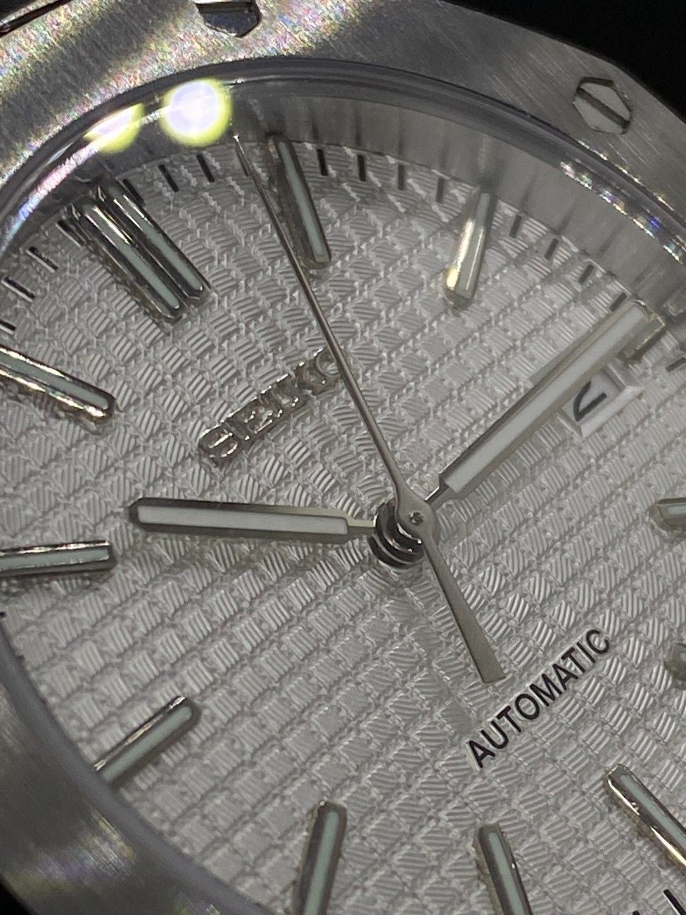 Royal Seikoak White Seiko Mod es un reloj que combina elegancia refinada y estilo moderno. Su bisel de acero 904L aporta resistencia y acabado premium, mientras que la esfera blanca luminosa garantiza legibilidad máxima y contraste sofisticado. Cada detalle refleja un diseño pensado para quienes buscan imponerse con estilo y presencia.